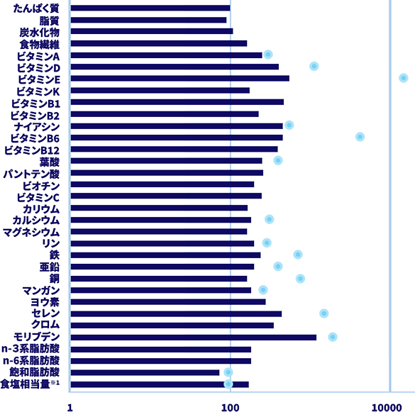 | 日本人の食事摂取基準をもとに、男性30〜49歳、身体活動レベルⅡの指標を100とした場合に当該商品のエネルギー値あたりの充足率を数値化したもの(たんぱく質、脂質、炭水化物は三大栄養素のバランスの指標範囲の中央値<たんぱく質16.5%、脂質25%、炭水化物57.5%>を100としたもの、飽和脂肪酸は指標の7%エネルギーを100としたもの) | |