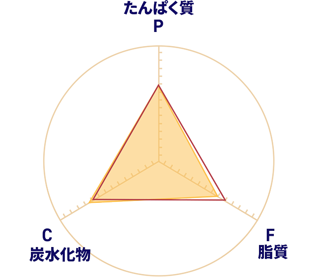 | ※2 | 三大栄養素のバランスとは、食事の三大栄養素であるたんぱく質(Protein)・脂質(Fats)・炭水化物(Carbohydrates)のエネルギー比のこと。グラフは、三大栄養素のバランスの指標範囲の中央値(P:16.5%/F:25%/C:57.5%)を100として図式化。 |